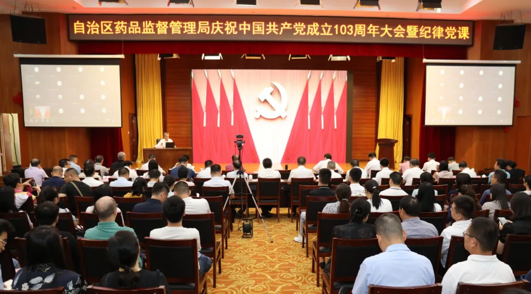 局党组成员、副局长韦广辉、万秋、沈宏睿出席会议。会议以线上线下相结合的形式,设主会场和分会场,局领导,今年“光荣在党满50周年”的老党员,机关各处室、南宁检查分局、各直属单位全体在职党员和干部在主会场参加会议,其他13个检查分局在分会场参加会议。