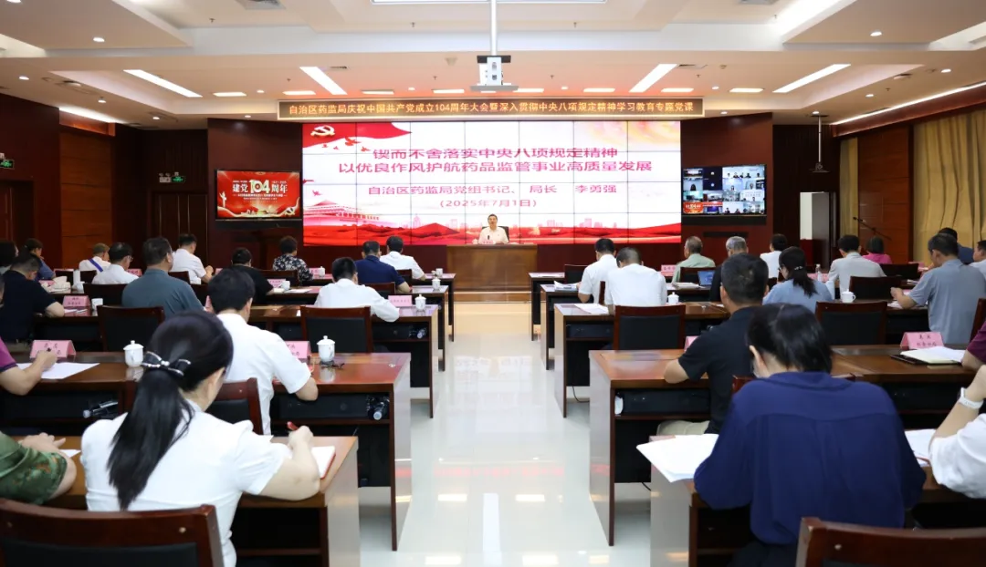 会上,李勇强以《锲而不舍深入贯彻中央八项规定精神,以优良作风护航药品监管事业高质量发展》为题,为全区药监系统党员干部讲授专题党课。强调要进一步巩固拓展主题教育成果和巩固深化党纪学习教育,锲而不舍深入贯彻中央八项规定精神。要坚持“关键少数”示范引领,坚持对表对标精准施治,坚持风腐同查同治,坚持“制度铁规”刚性约束,大力弘扬优良作风,坚持实干为要、创新为魂,用业绩说话、让人民评价,奋勇争先,在新征程上展现药监党员干部的新面貌新作为。